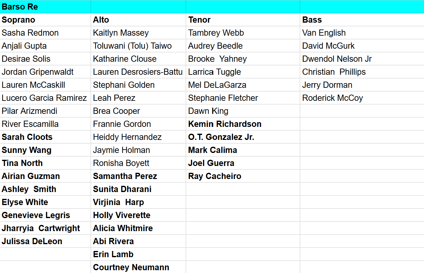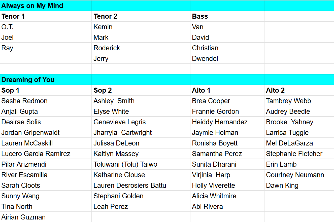 Voice parts have been arranged for Barso Re, Always on My Mind, and Dreaming of You. You can find those in the tables below and on the PPDs page of the Member Website (where PPDs also will be added this week).
